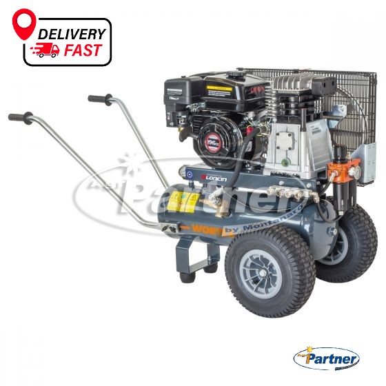 Motocompressore con motore a scoppio a benzina LONCIN da 6,5 Hp. Avviamento a strappo con fune autoavvolgente. La maniglia pieghevole lo rende estremamente compatto e adatto al trasporto. Un telaio pratico e maneggevole dotato di ruote pneumatiche facilita gli spostamenti anche su terreni accidentati. Testata bicilindrica monostadio. Valvola automatica di sfiato e messa a vuoto che mantiene la pressione costante nel serbatoio. Completo di filtro-riduttore-lubrificatore, manometro in glicerina e rubinetti rapidi universali.
